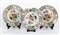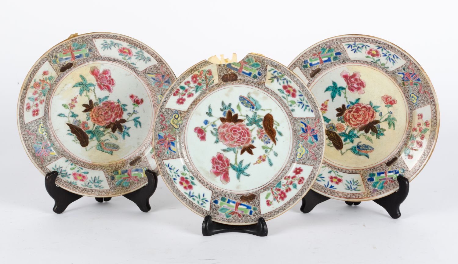 TRE PIATTI in porcellana dipinta a motivo floreale (rotture, restauri e...