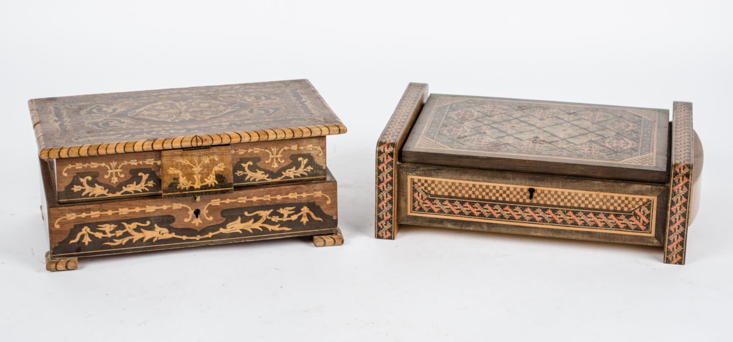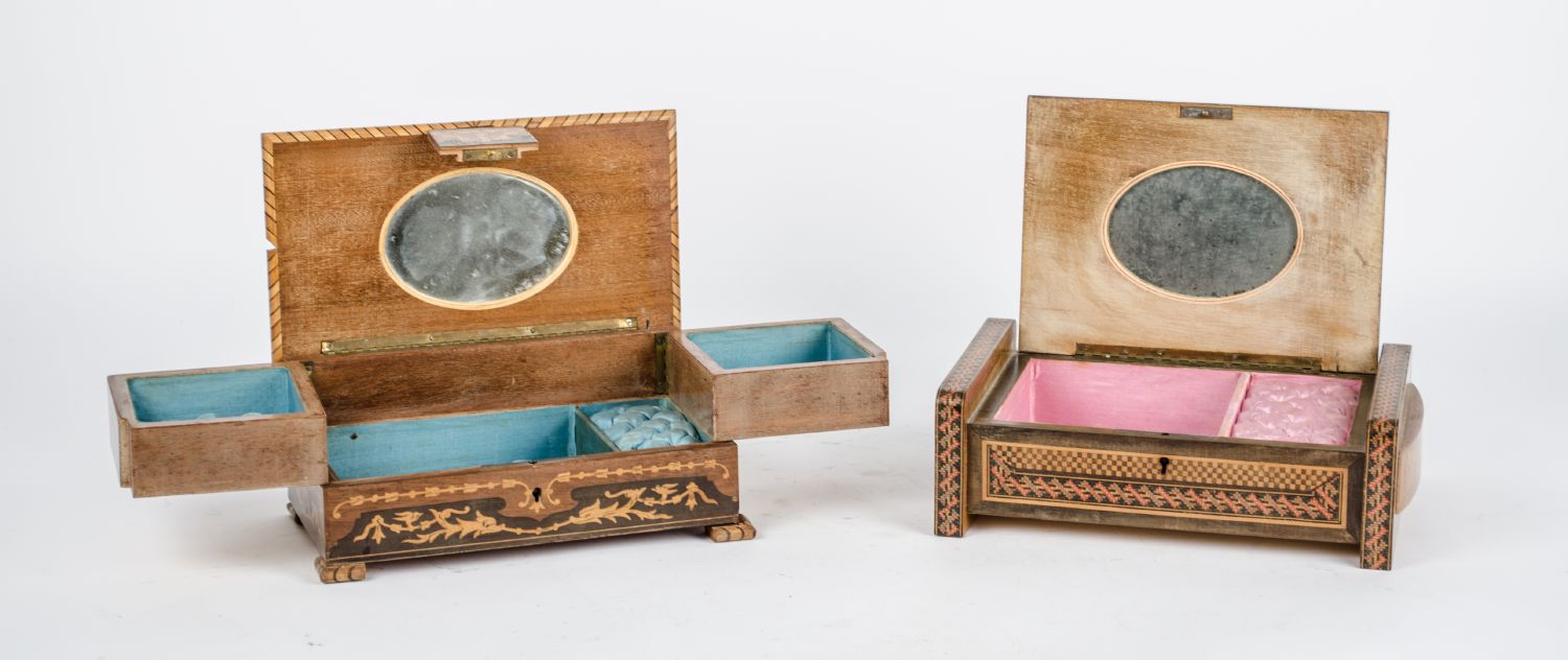 DUE SCATOLE portagioie in noce con tarsie in bosso. Primi '900 Misure: varie