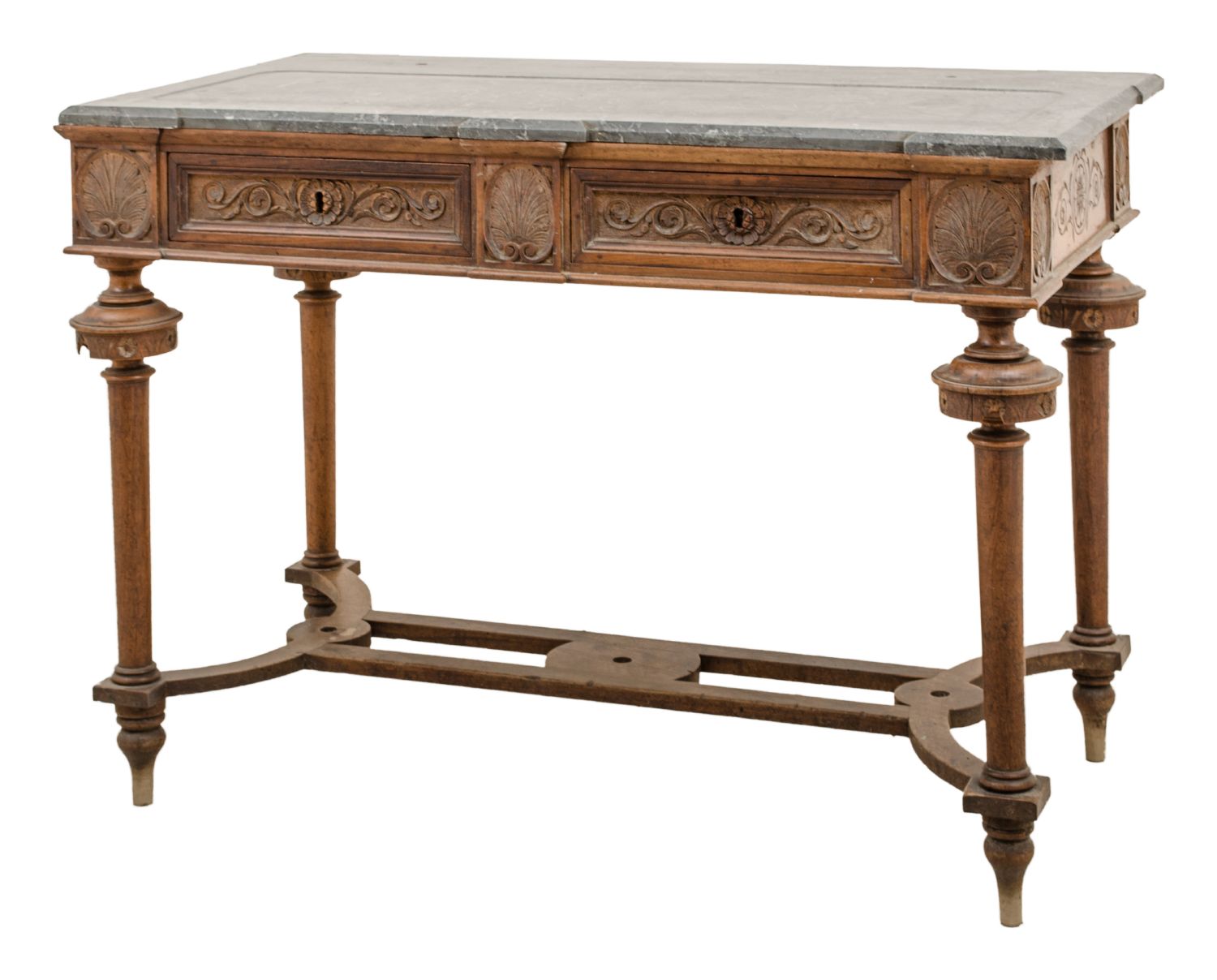 TOLETTA Umbertina in noce intagliato, piano in marmo grigio venato. Sicilia fine '800 Misure: cm 110 x 60 x h 80
