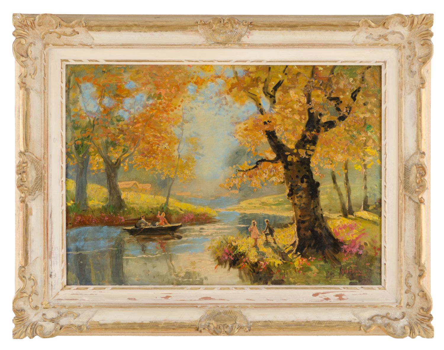 GIORDANI OLIO su tela "paesaggio lacustre con personaggi", firmato in basso a destra. XX secolo Misure: cm 50 x 70