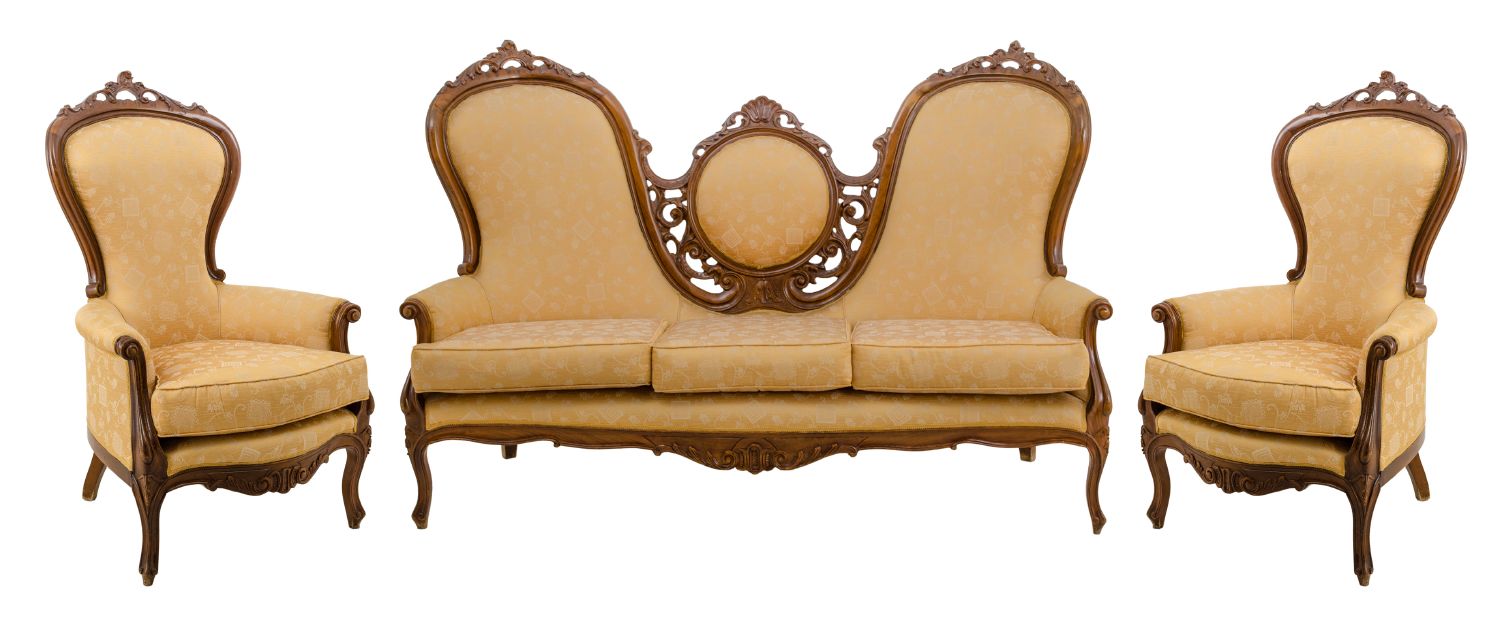 SALOTTO composto da DIVANO e due POLTRONE stile Luigi Filippo in noce. Italia XX secolo Misure: varie
