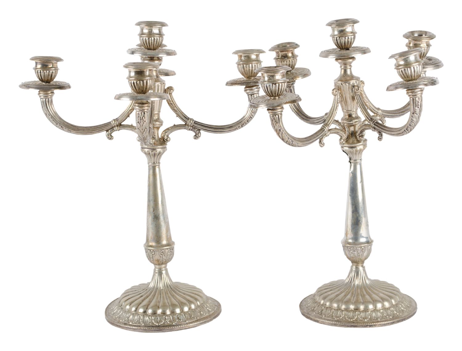 COPPIA CANDELABRI a cinque fiamme in argento (g. 394). XX secolo Misure: h cm 37