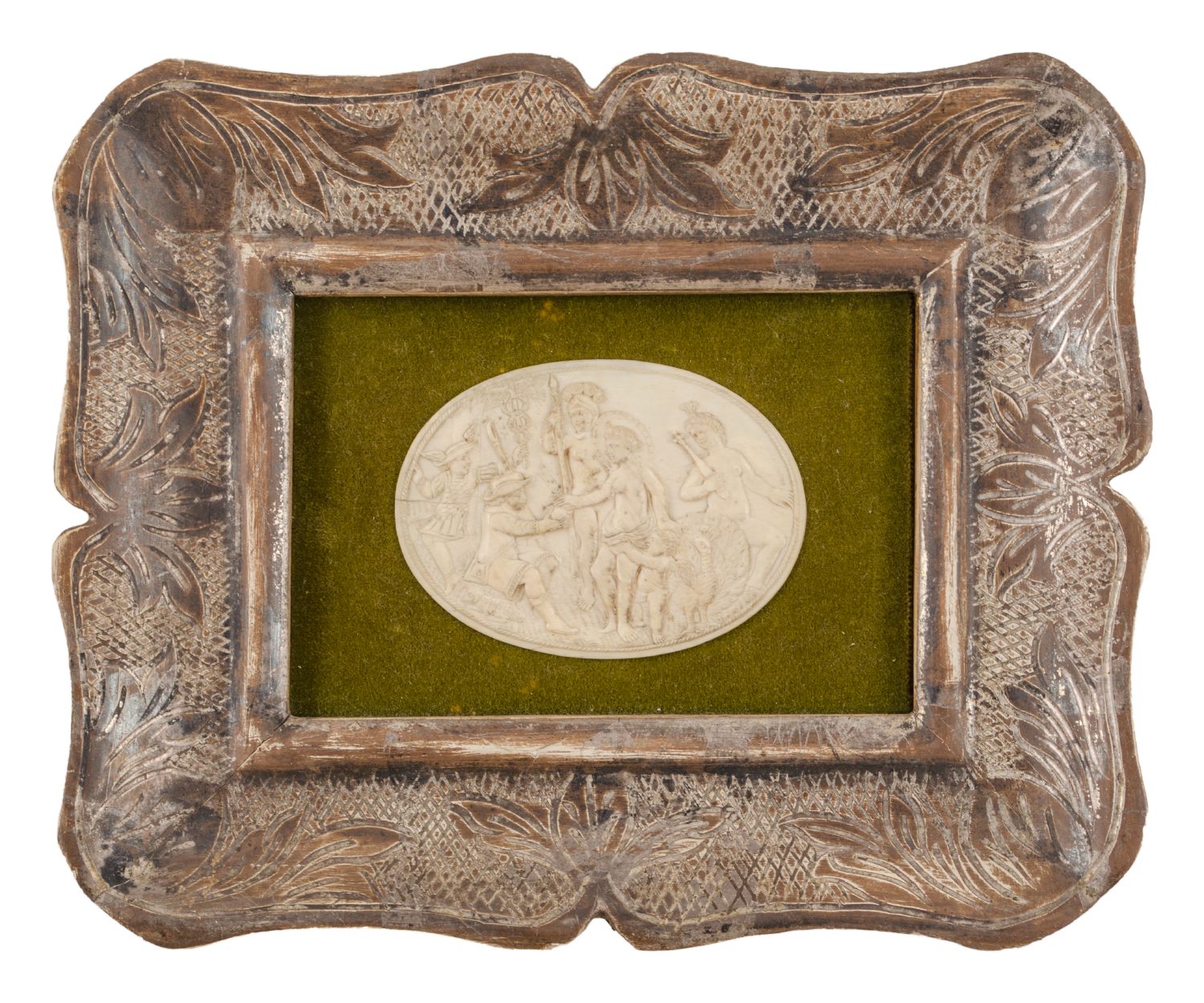 BASSORILIEVO ovale in avorio raffigurante "soldati con indigeni" entro cornice a guantiera del XIX secolo. Olanda XVIII secolo Misure: cm 10 x 70