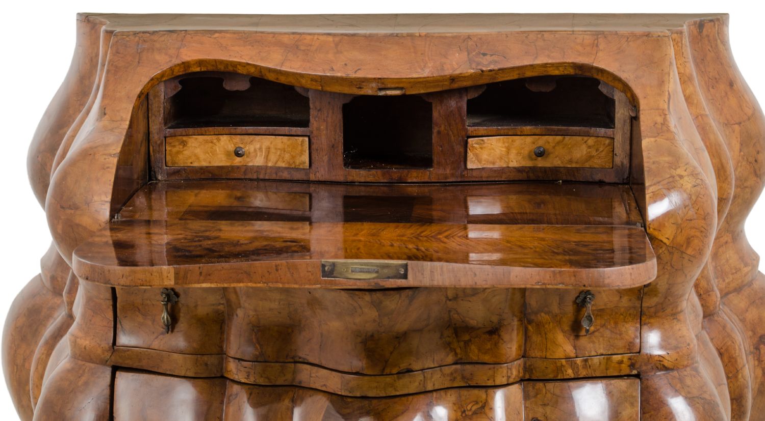 Lot 569 | BUREAU stile Barocco in radica di ulivo. Veneto XIX secolo Misure: cm 109 x...