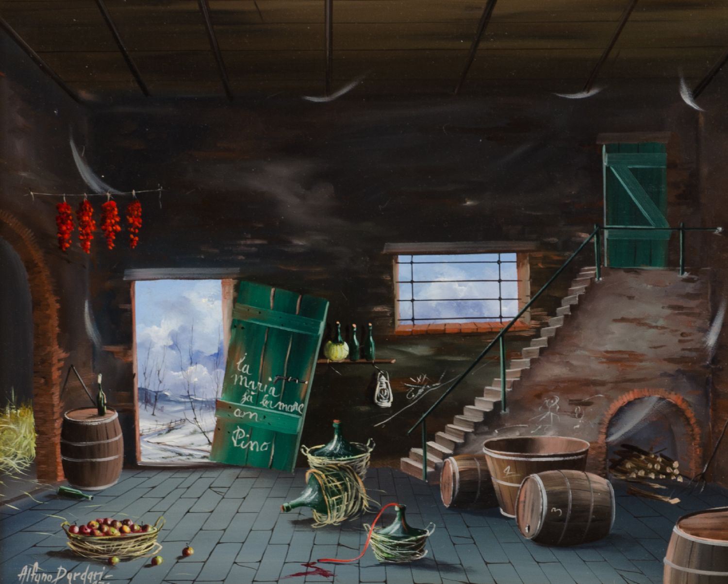 DARDARI ALFANO (Meldola 1924 - 1988) OLIO su tela "scena d'interno", firmato e datato in basso a destra (con autentica del pittore sul retro). Datato 1971 Misure: cm 40 x 50