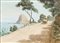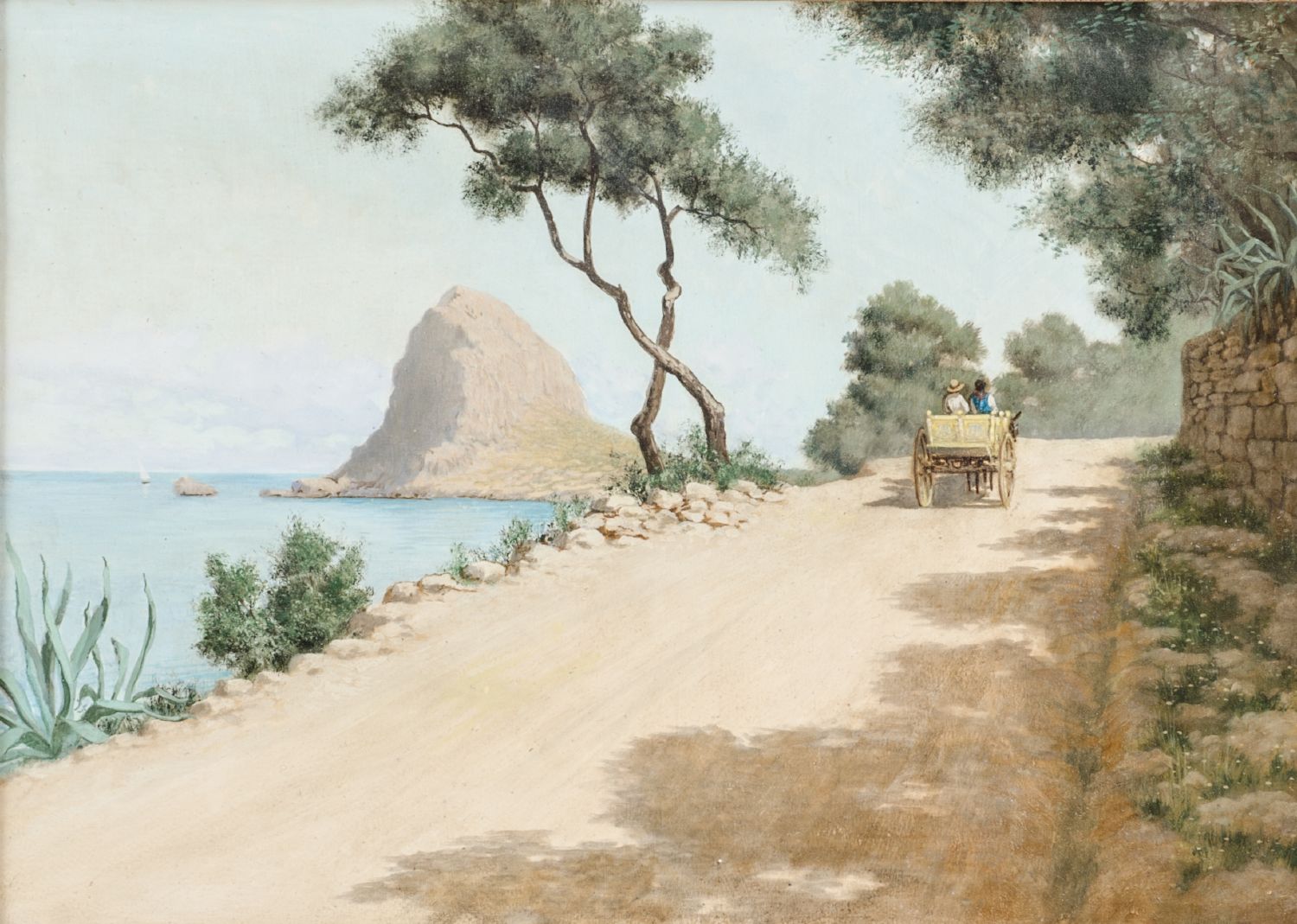 OLIO su cartoncino "strada costiera con personaggi su carretto". XX secolo...