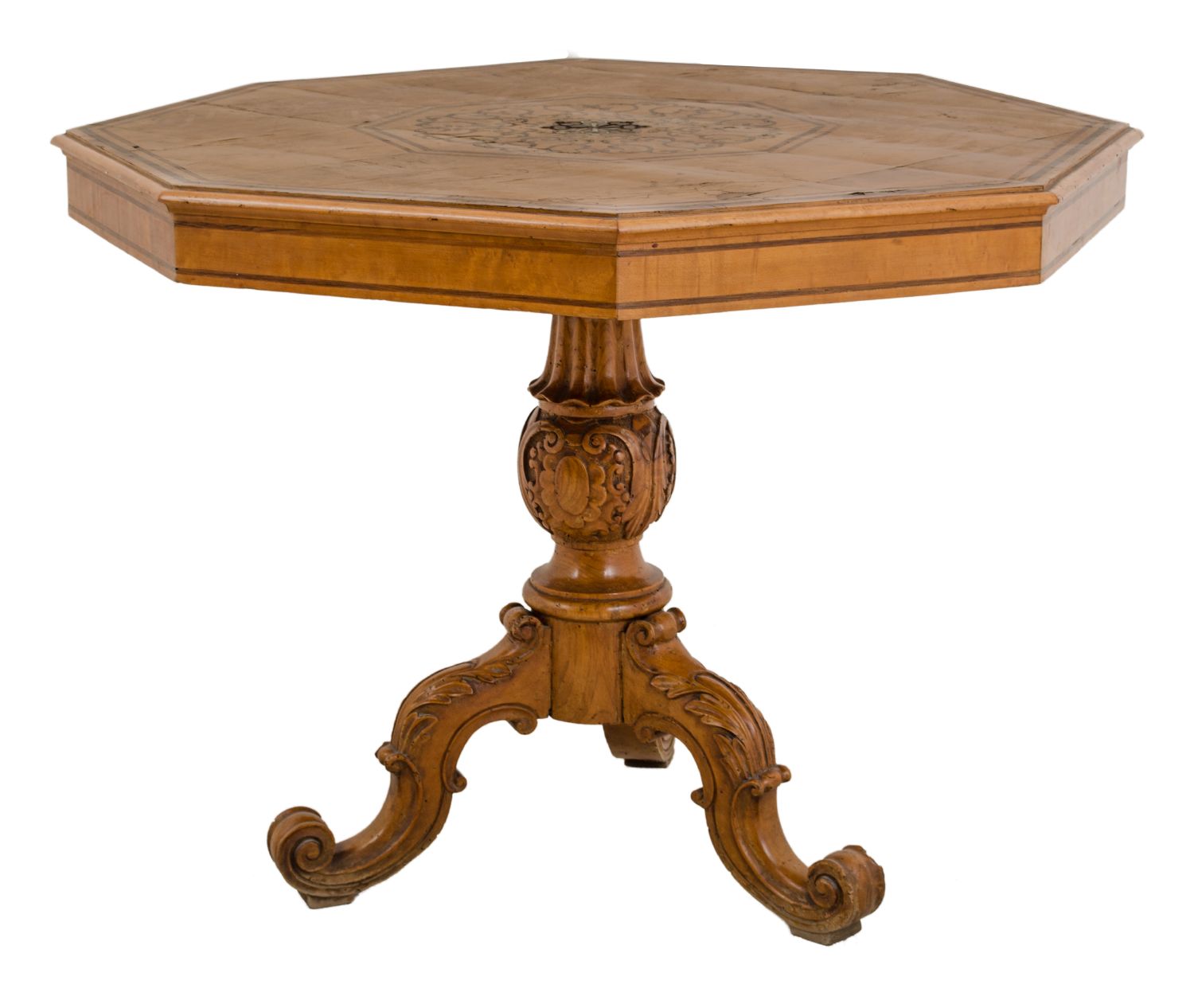 TAVOLO stile Carlo X ottagonale in noce con perfili centrali in palissandro,...