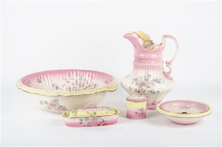 LOTTO composto da BROCCA, BACILE, due PORTASAPONI e da PORTA TALCO in ceramica smaltata e decorata a motivo floreale e fogliaceo. Francia primi '900 Misure: varie
