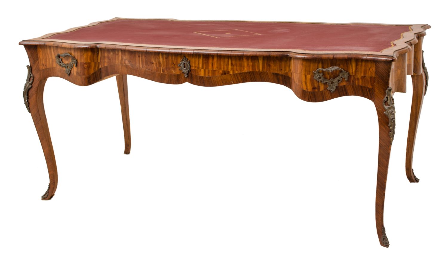 SCRIVANIA diplomatica stile Luigi XV a tre cassetti in legno di rosa con piano in pelle. Francia XIX secolo Misure: cm 172 x 85 x h 79