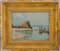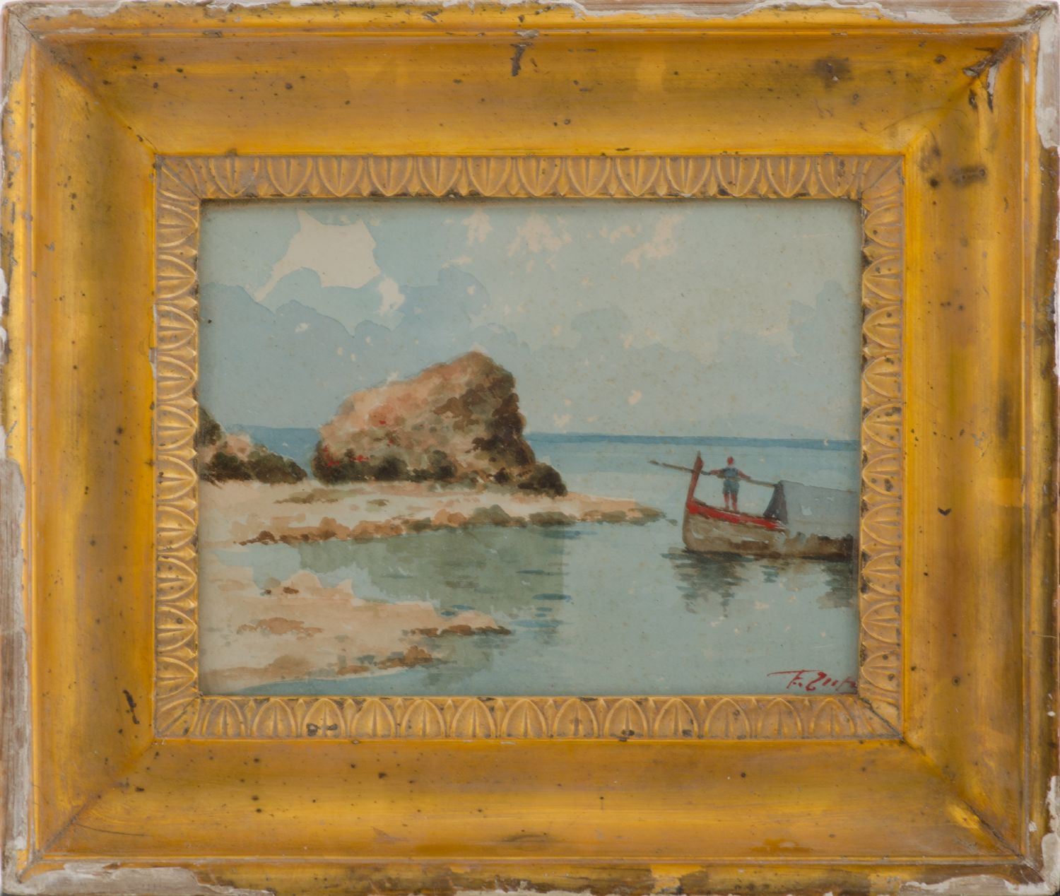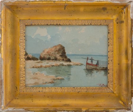 ACQUARELLO "paesaggio arino con pescatore" firmato in basso a destra entro cornice a canna ciaccata in legno dorato ad argento a mecca. Sicilia II meta' '800 Misure: cm 19 x 24