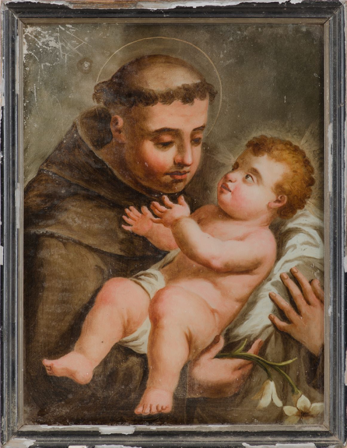 PITTURA su vetro raffigurante "Sant' Antonio con Bambino". Italia XIX secolo Misure: cm 44 x 34