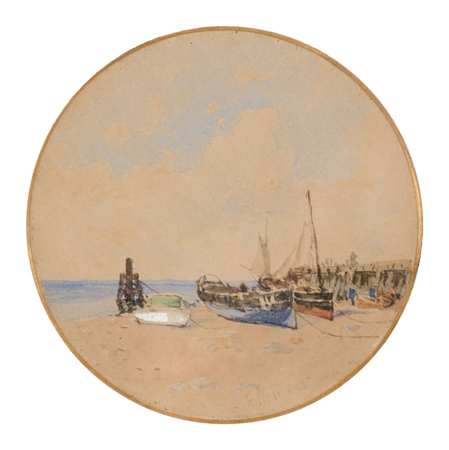 ACQUARELLO su carta di forma circolare "barche a secco" (tracce di firma in...
