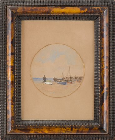 ACQUARELLO su carta di forma circolare "barche a secco" (tracce di firma in basso) entro cornice da tavolo in tartaruga (cm 27 x 22). XX secolo Misure: diametro cm 10