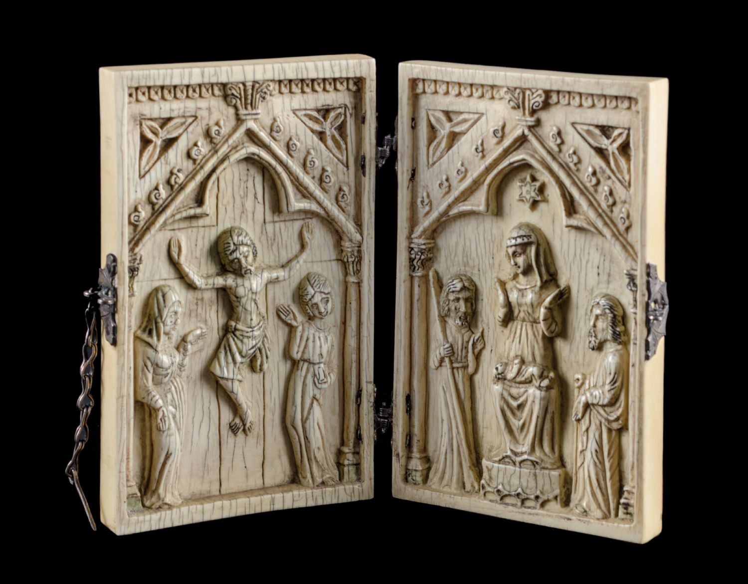 ALTORILIEVO in avorio stile neogotico con apertura a libro raffigurante...