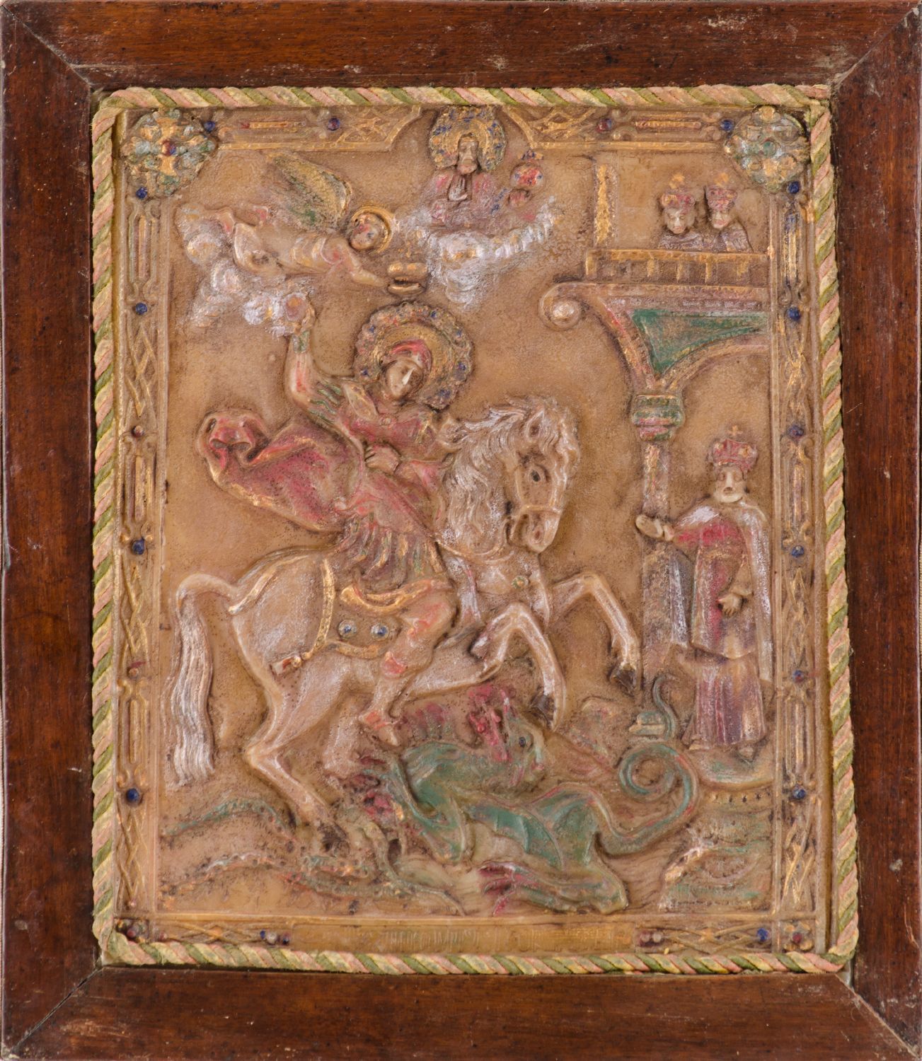BASSORILIEVO in cera raffigurante "San Giorgio con il drago". Italia XIX secolo Misure: cm 30 x 25