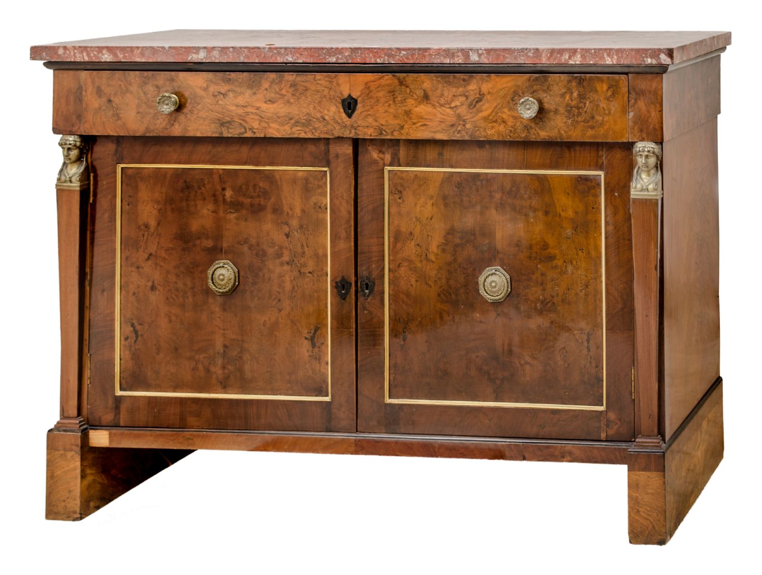 SERVANTE stile Impero a due ante in noce e radica di noce, piano in marmo rosso. XIX secolo Misure: cm 139 x 55 x h 96
