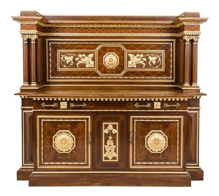 CREDENZA con alzata di gusto rinascimentale in noce con tarsie in bosso e...