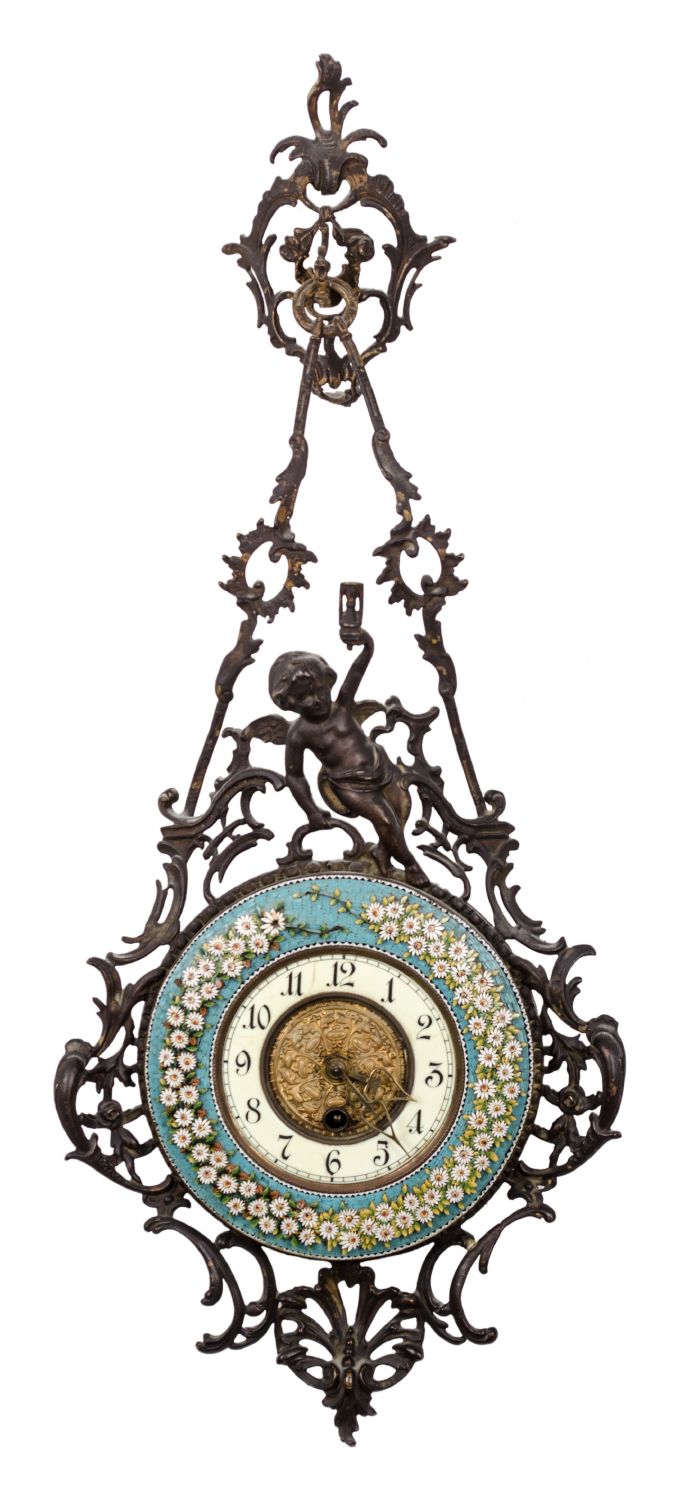 OROLOGIO da muro in bronzo e porcellana. Sicilia periodo Liberty primi '900 Misure: cm 26 x 65