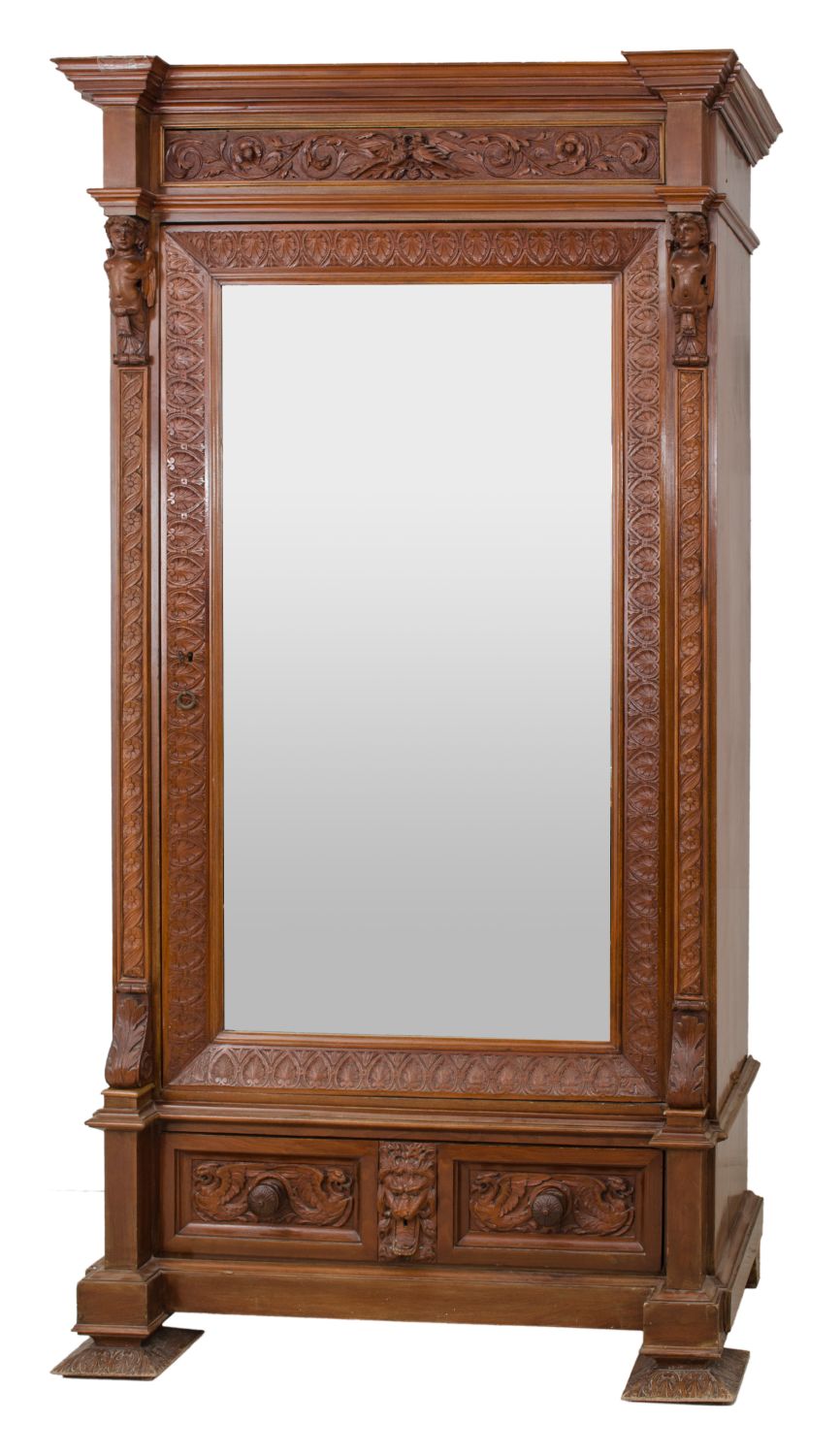 ARMADIO in noce ad un'anta con cassetto sottostante. XIX secolo Misure: cm 132 x 62 x h 244