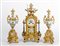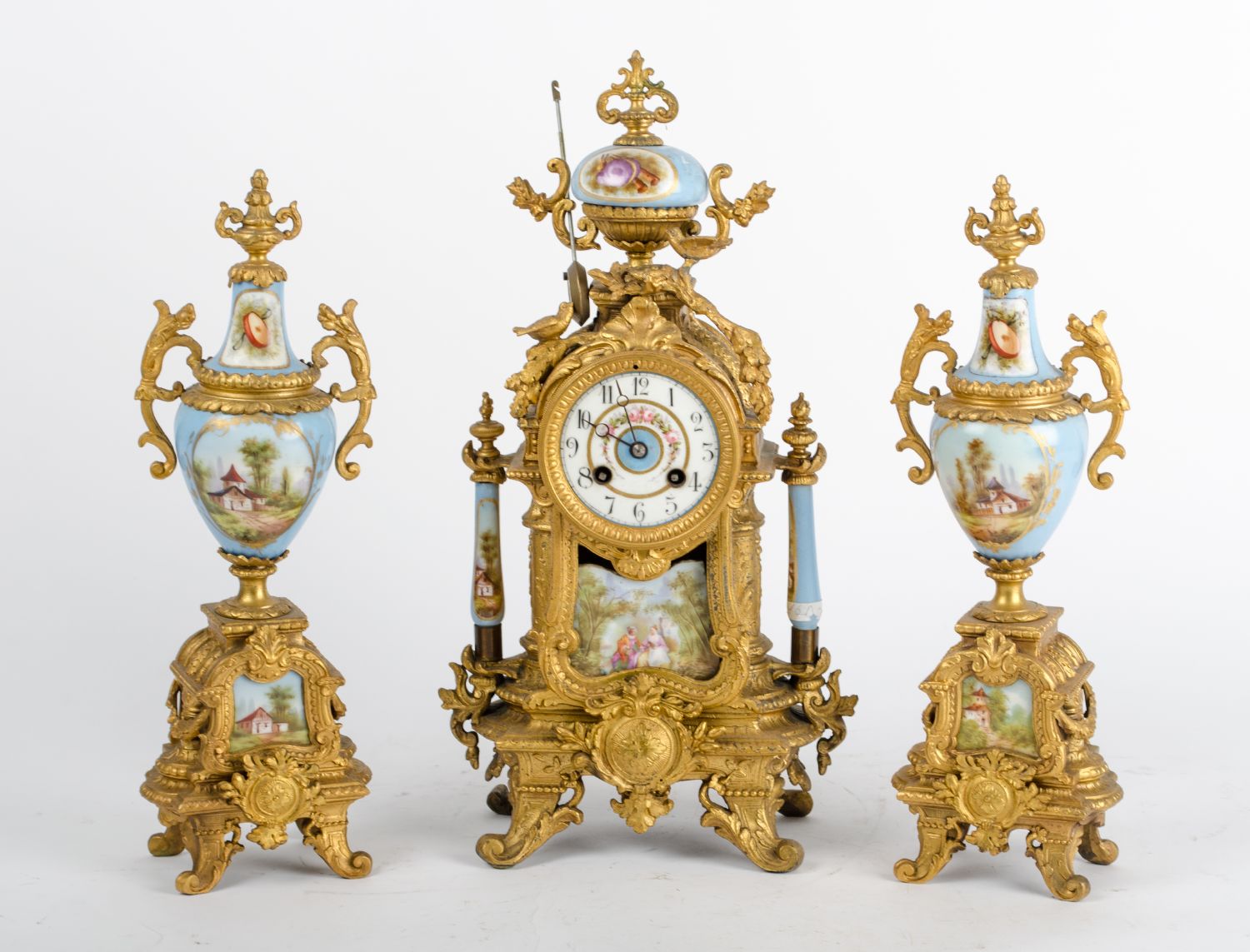 TRITTICO composto da OROLOGIO e da due POTICHE in metallo dorato e porcellana...