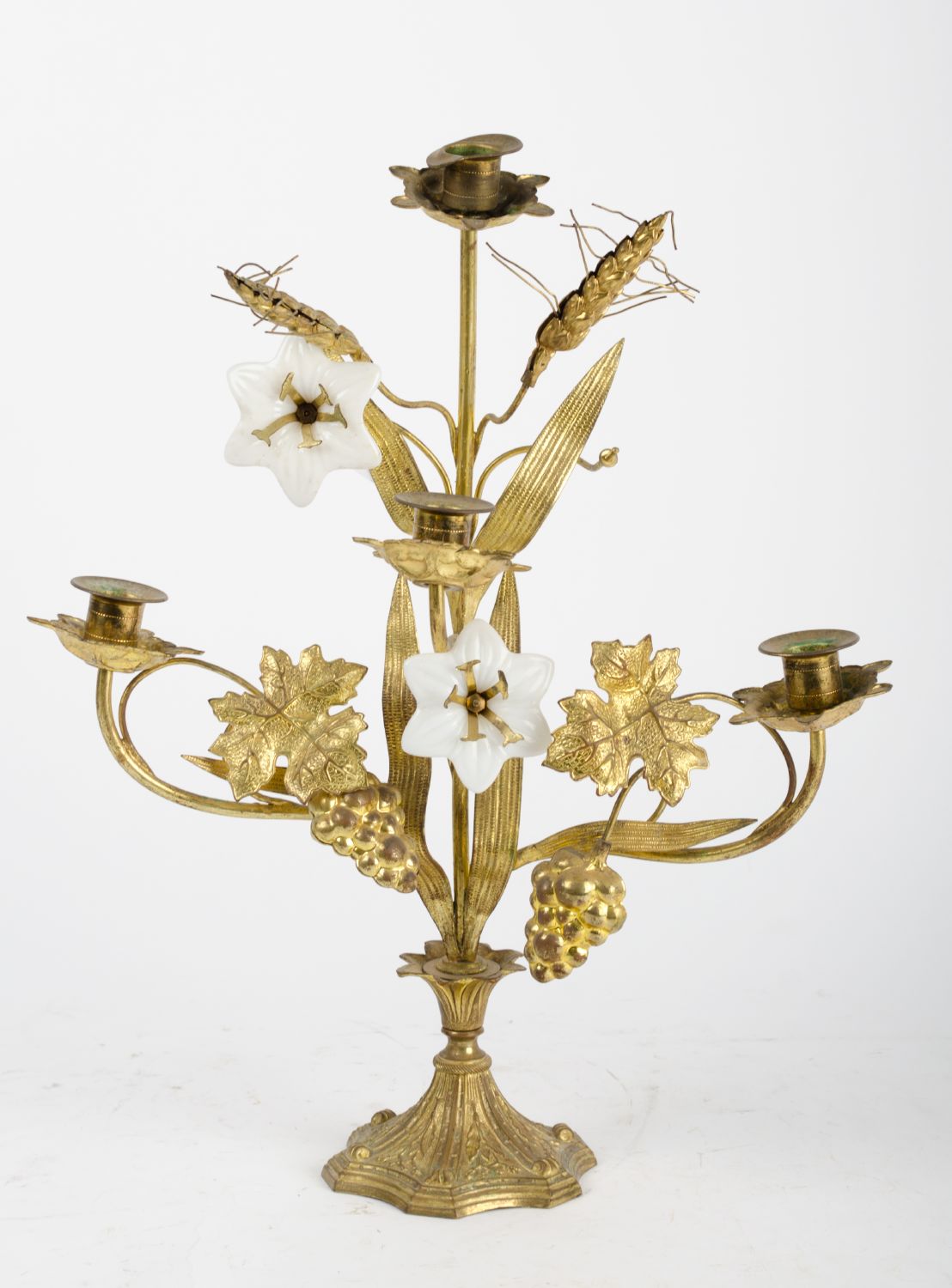 CANDELABRO a quattro fiamme in ottone dorato con fiori in opaline. Francia XIX secolo Misure: h cm 44