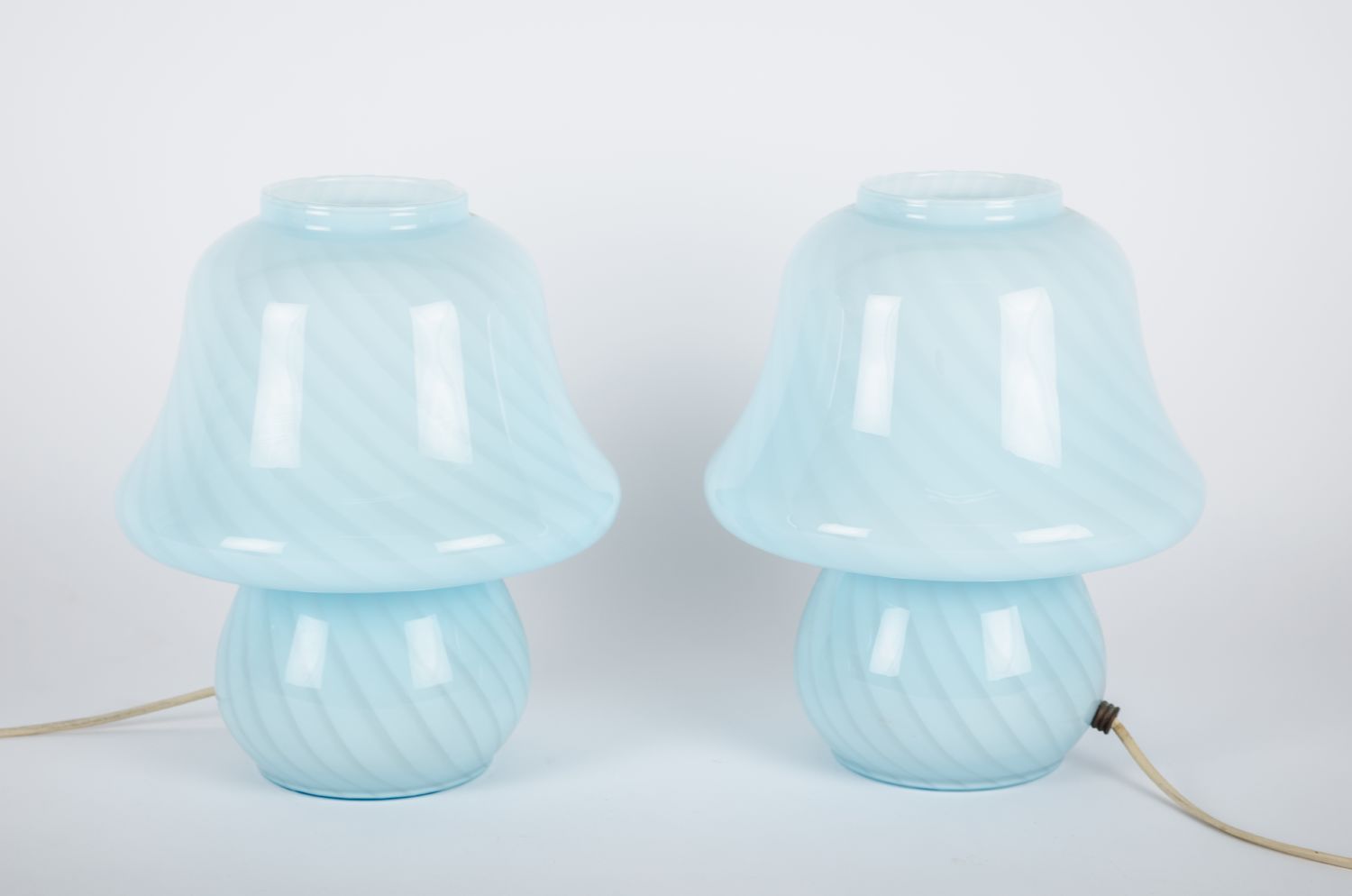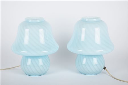 COPPIA LUMI in vetro Murano a forma di fungo nei toni del celeste. XX secolo Misure: h cm 29