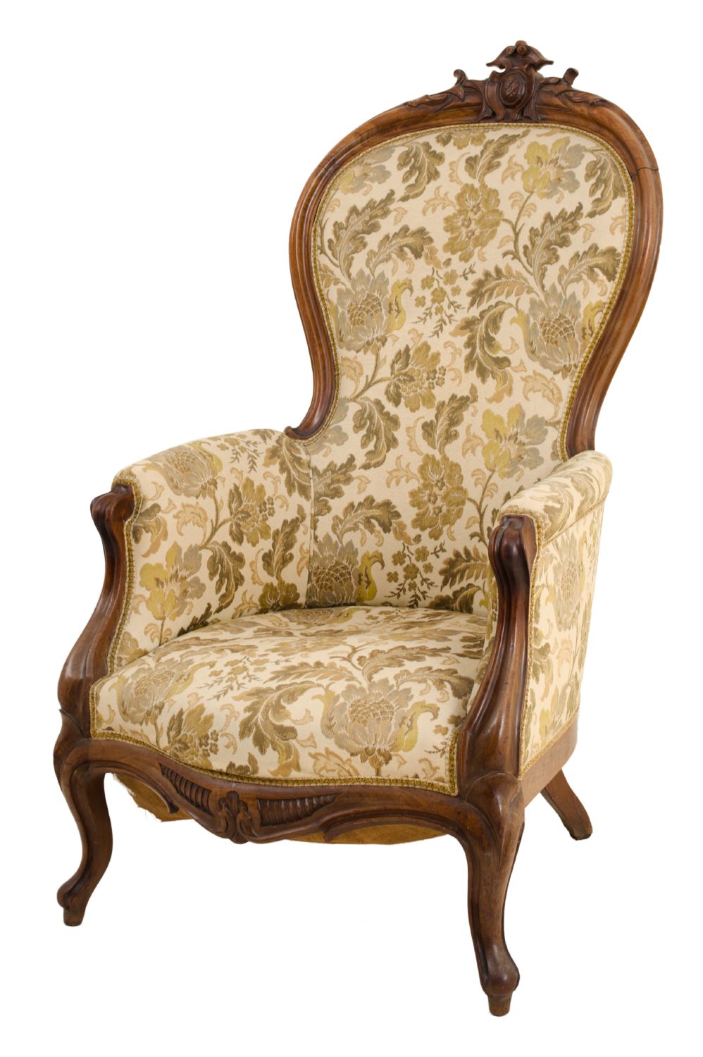 POLTRONA Luigi Filippo in noce scolpito con tappezzeria a motivo floreale....