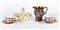 LOTTO composto da due TAZZE con piattini in porcellana stampigliata raffiguranti "scene neoclassiche", BROCCA maltese in porcellana e da CESTINO Luigi Filippo in porcellana bianca decorata a motivo floreale e lumeggiata in oro. XX secolo Misure: varie