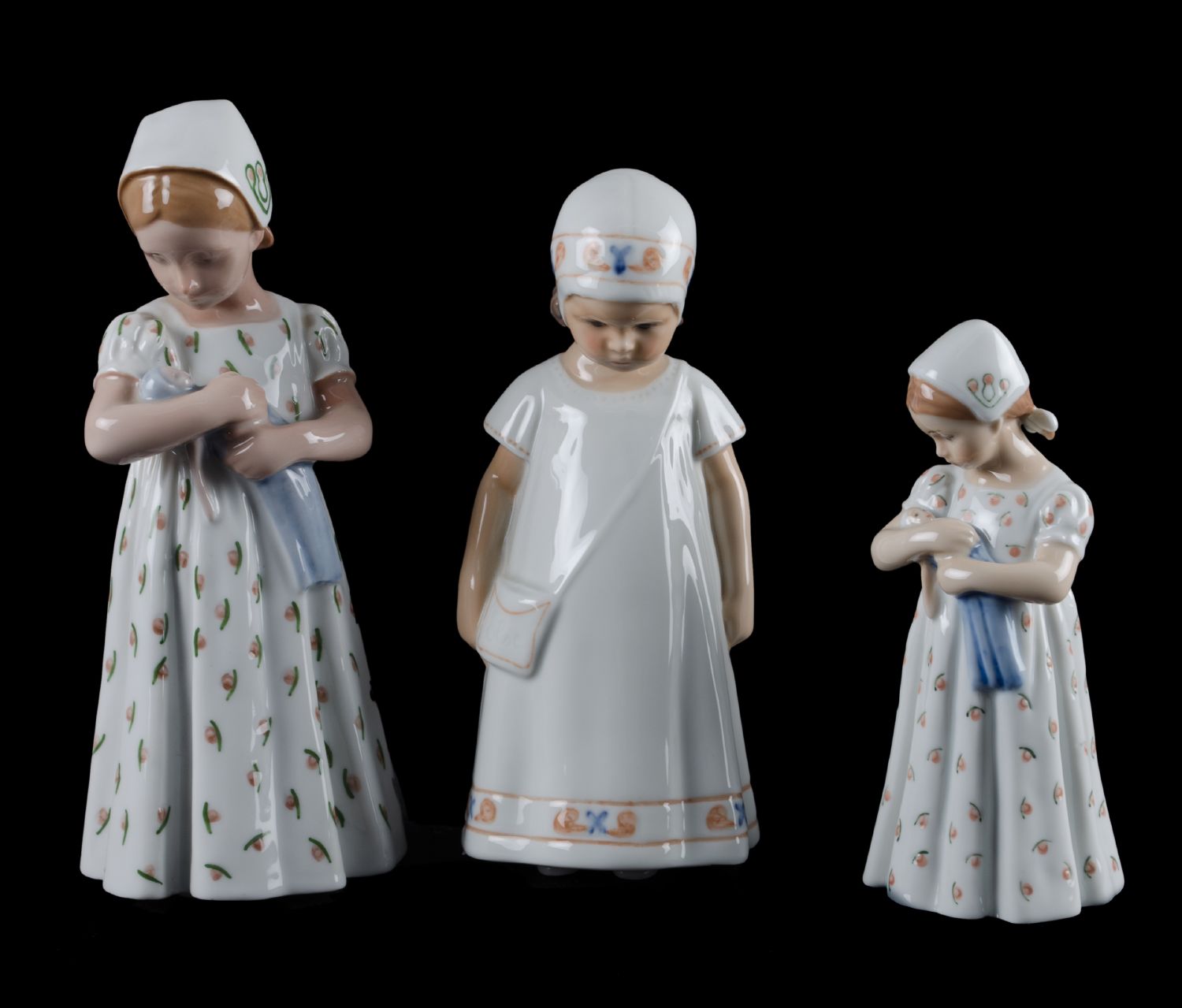LOTTO composto da due SCULTURE in porcellana Royal Copenaghen raffigurante "fanciulle" e da SCULTURA in porcellana B&G raffigurante "fanciulla". XX secolo Misure: varie