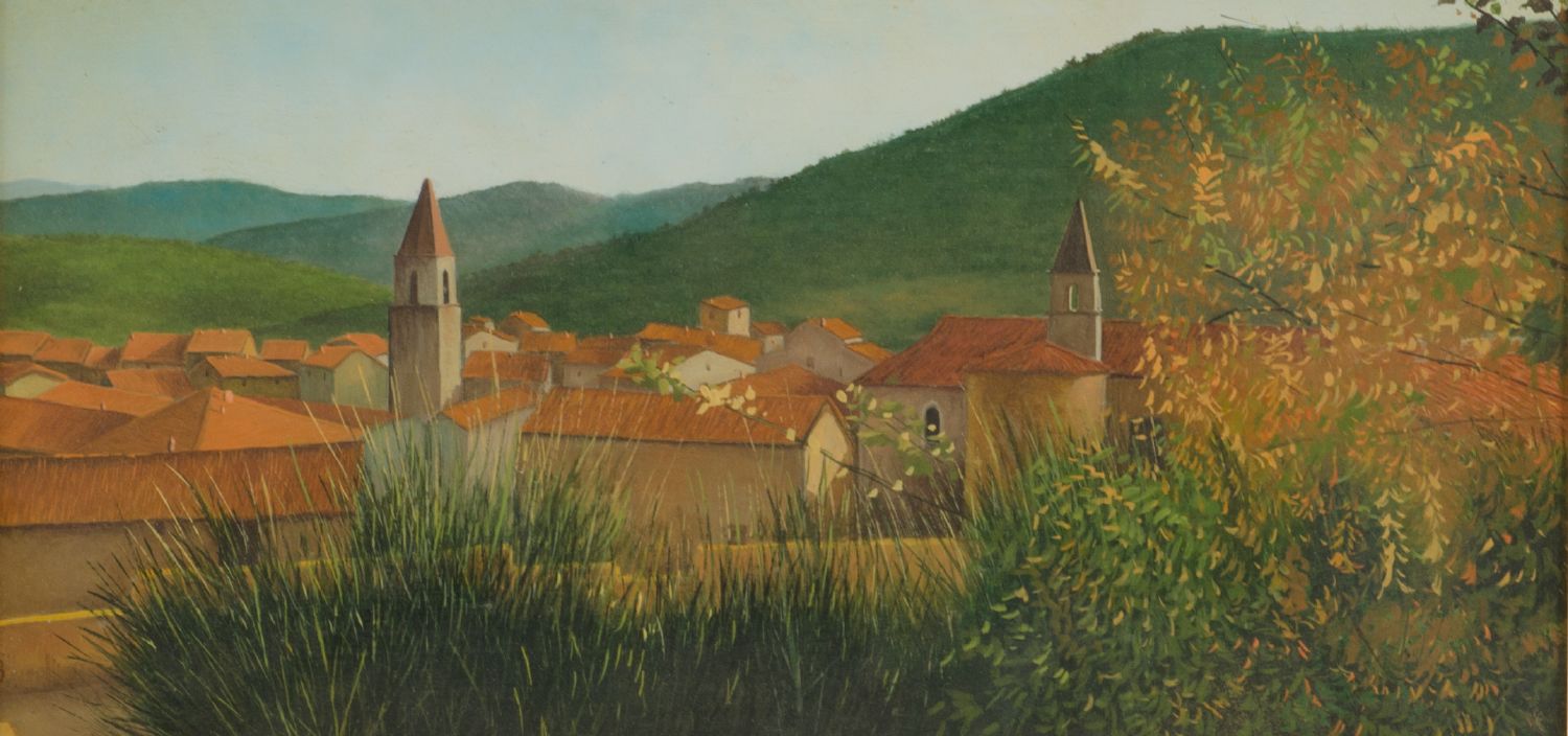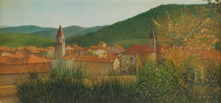 OLIO su cartone "tetti". XX secolo Misure: cm 21 x 41