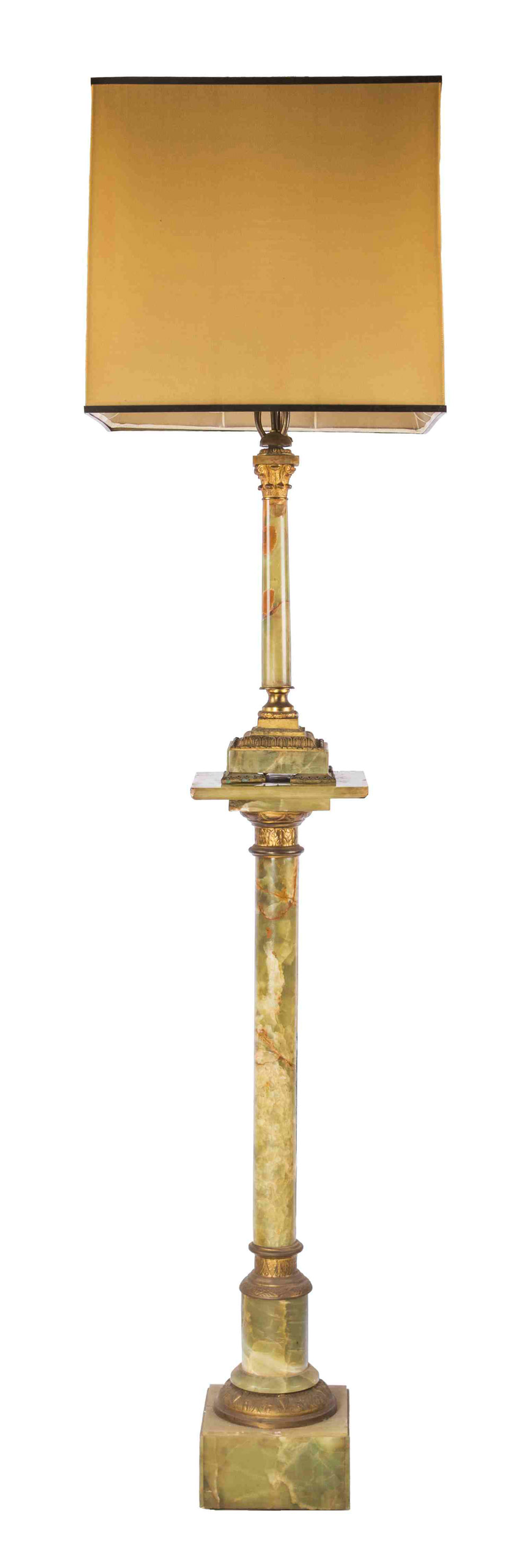 Lume da tavolo in alabastro verde con decori in metallo con colonna di appoggio en suite. Altezza cm 210