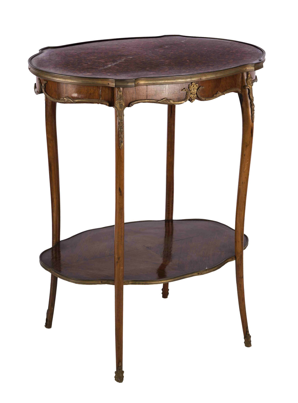 Tavolino francese ovale, Francia fine del XIX secolo con piano in marmo rosso, profili in bronzo dorato. Misure cm 72 x 45 x 41