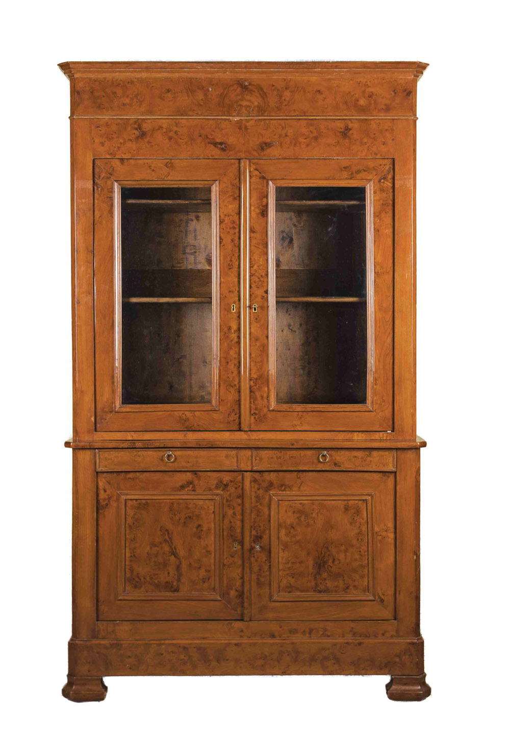 Credenza a Doppio Corpo del XIX secolo in radica di olmo, sportelli a vetri nella parte superiore piano estraibile celato da finti cassetti. Misure cm 228 x 128 x 48