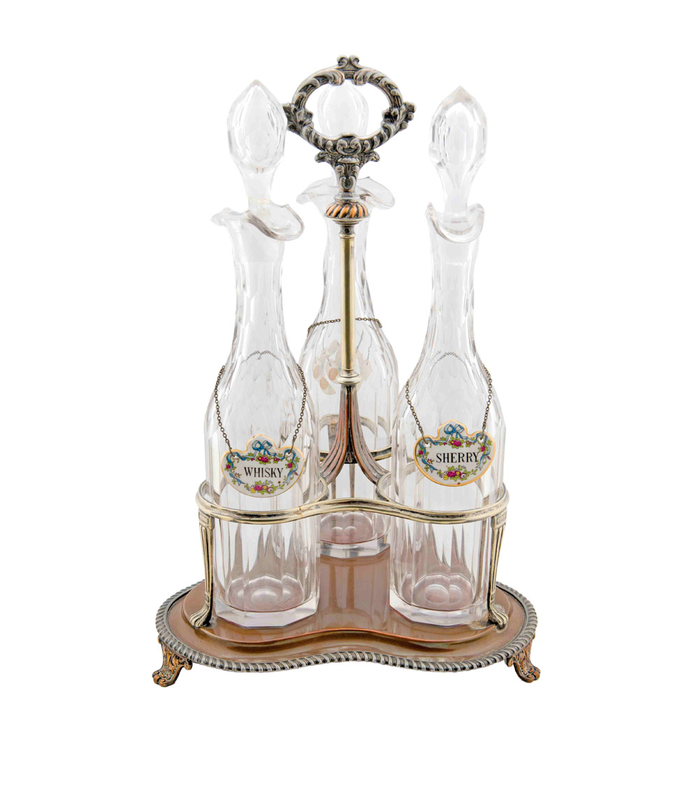 Portaliquori in metallo argentato e tre bottiglie in cristallo Misure cm 40 x 26