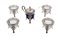 Lotto di QUATTRO salierine ed una mostardiera in argento e vetro, Inghiterra XIX secolo Supporti a forma di cariatide e piedini ferini. Grammi 285 ca.