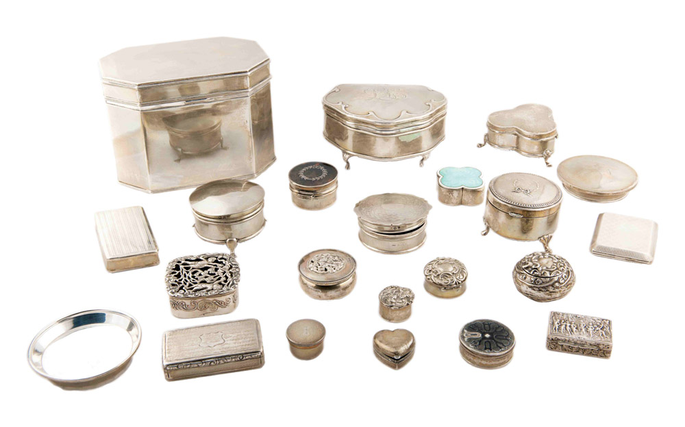 Lotto di 21 tra scatole e portapillole in argento Diverse misure e provenienze. Grammi 1400 lordi