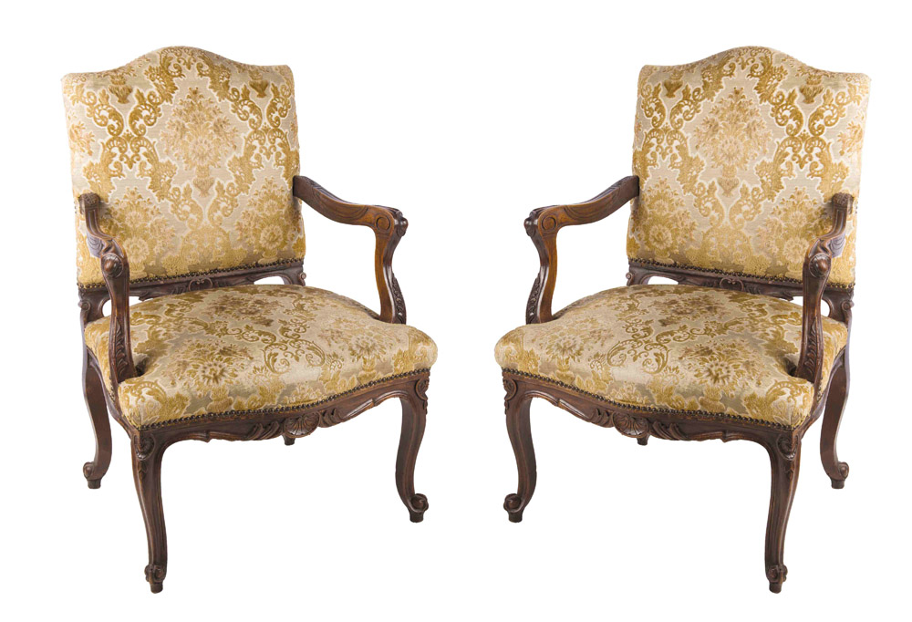 Coppia di poltrone in noce stile Luigi XV Schienali e sedute imbottite,...