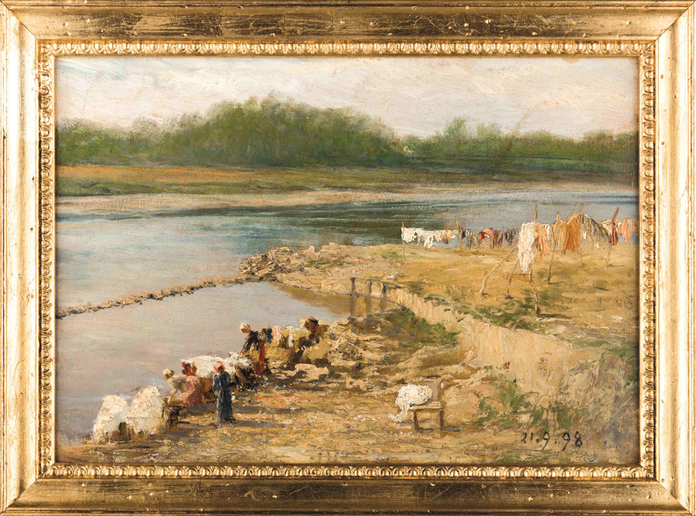 Lorenzo Delleani Pollone 1840-Torino 1908 Lavandaie al Fiume Datato in basso a destra Olio su tavola. Misure cm 25,5 x 37