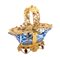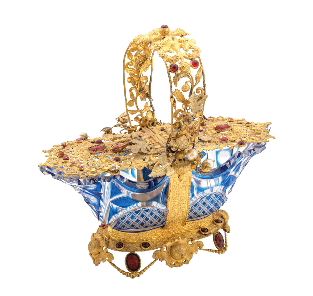 Importante cestino in filigrana XIX secolo finemente lavorato a motivi vegetali con applicazioni di corniole incise e granati; contenitore in cristallo molato bianco e blu. Mancanze e difetti. Misure cm 21 x 23