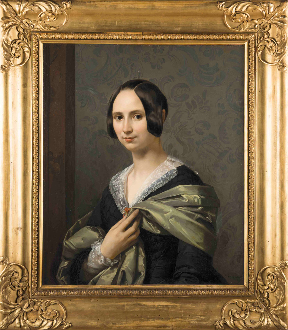 Francesco Podesti Ancona 1800-Roma 1895 Gentildonna Firmato in basso a destra Presto vive a Roma allacciando amicizie come Landi e Camuccini raggiungendo velocemente la fama. Alternò motivi mitologici a quelli storici primeggiando sempre. Fu prediletto dalla Curia Romana che commissionò un gran numero di lavori in tutta la città. L’aspetto maggiormente apprezzato si deve ai numerosissimi ritratti sopratutto eseguiti per la clientela di aristocratici e personaggi famosi. Questo dipinto si può datare intorno agli anni trenta, e dimostra, se ce ne fosse bisogno, l’immediata soavità ed eleganza che riesce a trasmettere. Perfetta la conservazione del dipinto e della cornice. Olio su tela. Misure 73 x 61