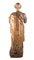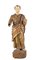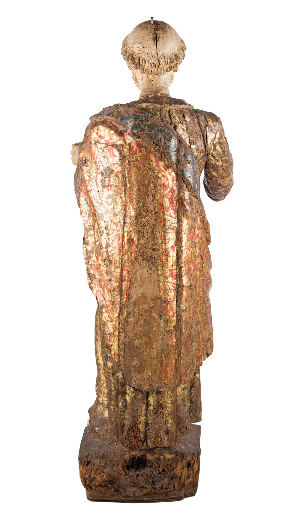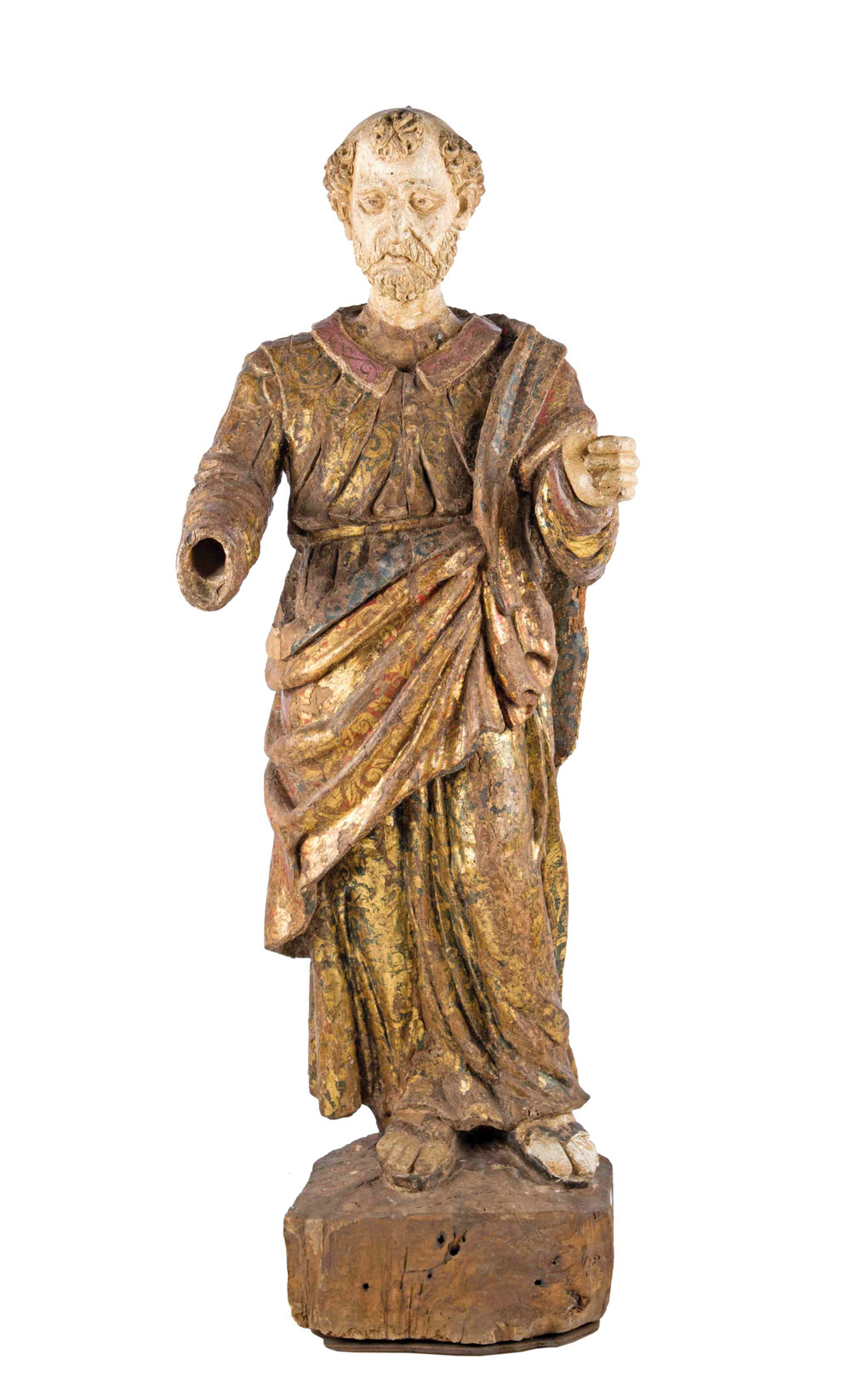 SCULTURA LIGNEA, ITALIA XVI SECOLO La statua rappresenta un Santo a tutto tondo, con vista frontale. La gamba sinistra è leggermente sollevata. Le due braccia sono tese in avanti: la mano sinistra probabilmente reggeva qualcosa (forse un pastorale), mentre la destra manca completamente. Veste una tunica decorata con il motivo del broccato, in verde scuro e oro, sostenuta in vita da una cinta, con bottoni nella parte superiore; colletto e polsi sono rosa con motivi decoratrivi chiari. Sopra veste un mantello che dalla spalla sinistra passa sul fianco destro sotto il braccio, ed è sorretto in vita sul fianco sinistro. Anche il manto è decorato con motivi di tipo broccato, in rosso e oro; mentre la parte interna dello stesso è color blu-verde scuro. Calza semplici sandali infradito. Barba e capelli sono ricci con una vasta chierica e l’impostazione per un aureola. Altezza cm 130