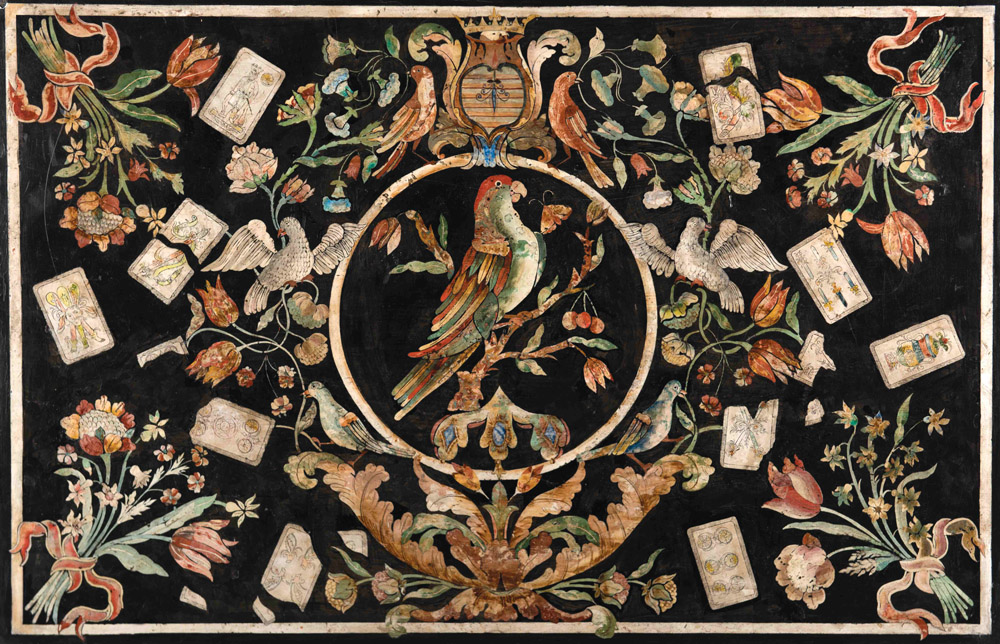Scagliola con carte da gioco e papppagallo, Napoli XVIII secolo Questo manufatto nasce per ovviare alla carenza di marmi in alcune nostre regioni. Sembra che i primi lavori conosciuti risalgano al tardo Seicento o al primo Settecento in Emilia. Si compongono di un piano nero e di fantasiosi animali coloratissimi. Si conoscono molti esemplari di paliotti ma i più pregiati sono considerati quelli a carattere profano usati come piani per tavoli da gioco. Molti risultano decorati con carte da gioco scompigliate e sono di origine napoletana. Rare e apprezzate più d’altre sul mercato. Misure cm 65 x 100