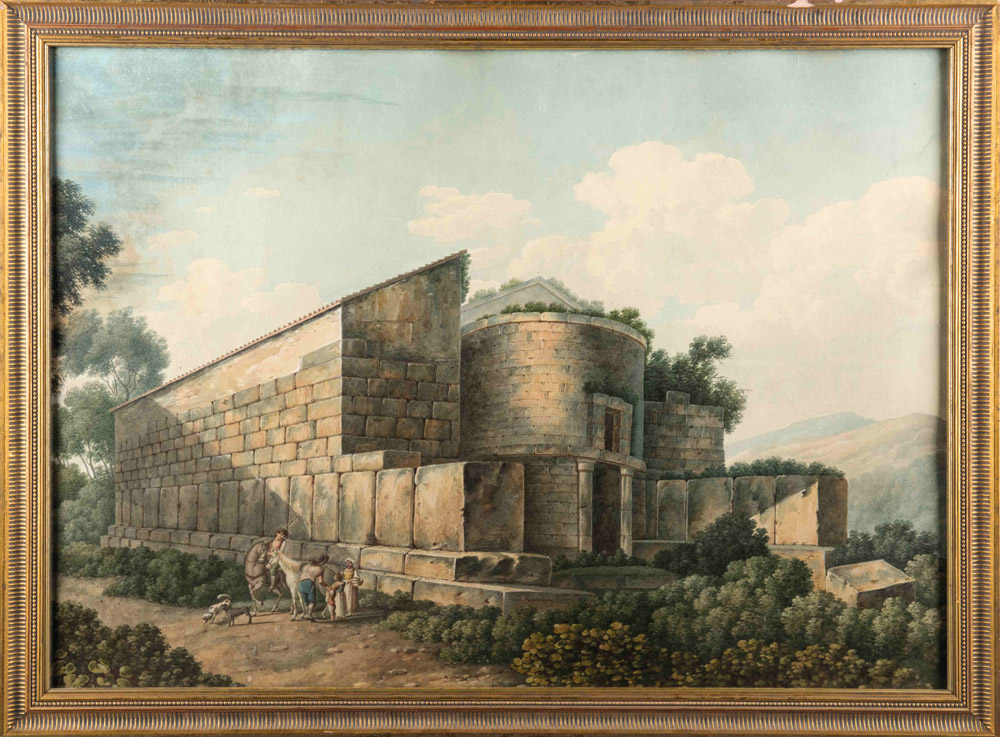 Franz Kaisermann Yv erdon 1755-Roma 1833 Paesaggio con Pastorelle Firmato datato 1810 al centro I recenti scavi archeologici hanno portato alla luce in Abruzzo una città romana che portava il nome di “Alba Fucens” il cui tempio è probabilmente qui rappresentato; il dipinto raffigura infatti un paesaggio con popolani in prossimità di un tempio arcaico. Nonostante il crollo dovuto a un terremoto si può ancora identificare il luogo e le tracce del perimetro del tempio e parte del muro absidale. Tecnica mista su cartoncino. Misure cm 74 x 54