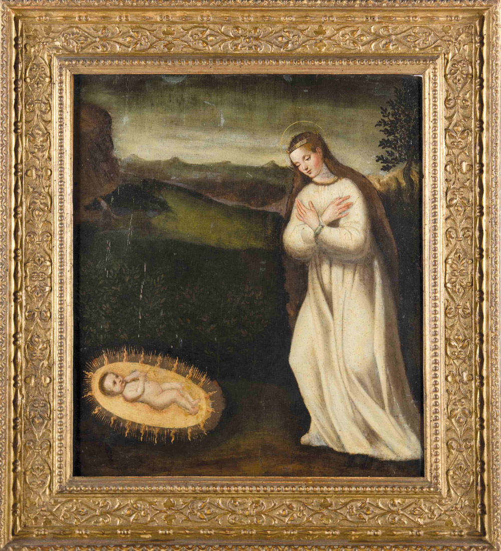 Scuola Ferrarese del XVI secolo Adorazione del Bambino Olio su tavola. Misure cm 53 x 45