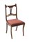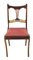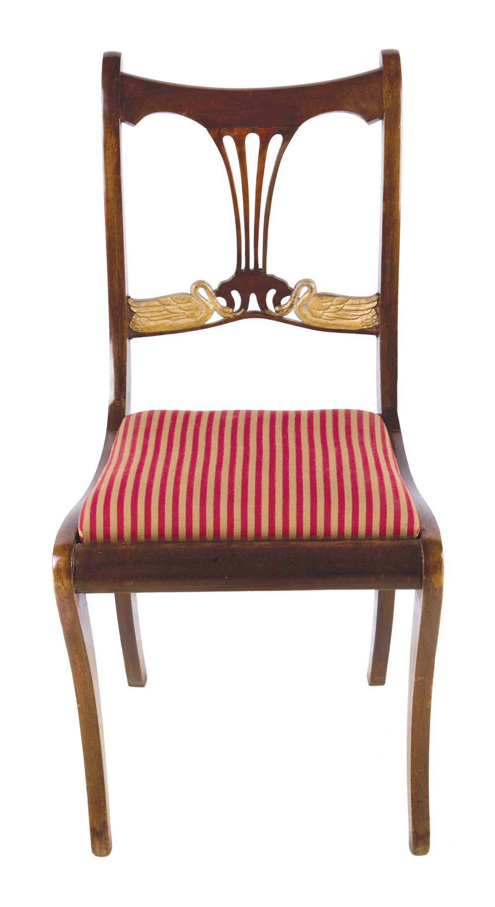 Quattro sedie in noce Seduta imbottita con stoffa a righe rosse e beige; spalliera abbellita con due cigni in legno dorato e intagliato, gambe a sciabola. Misure 90 x 45 x 48