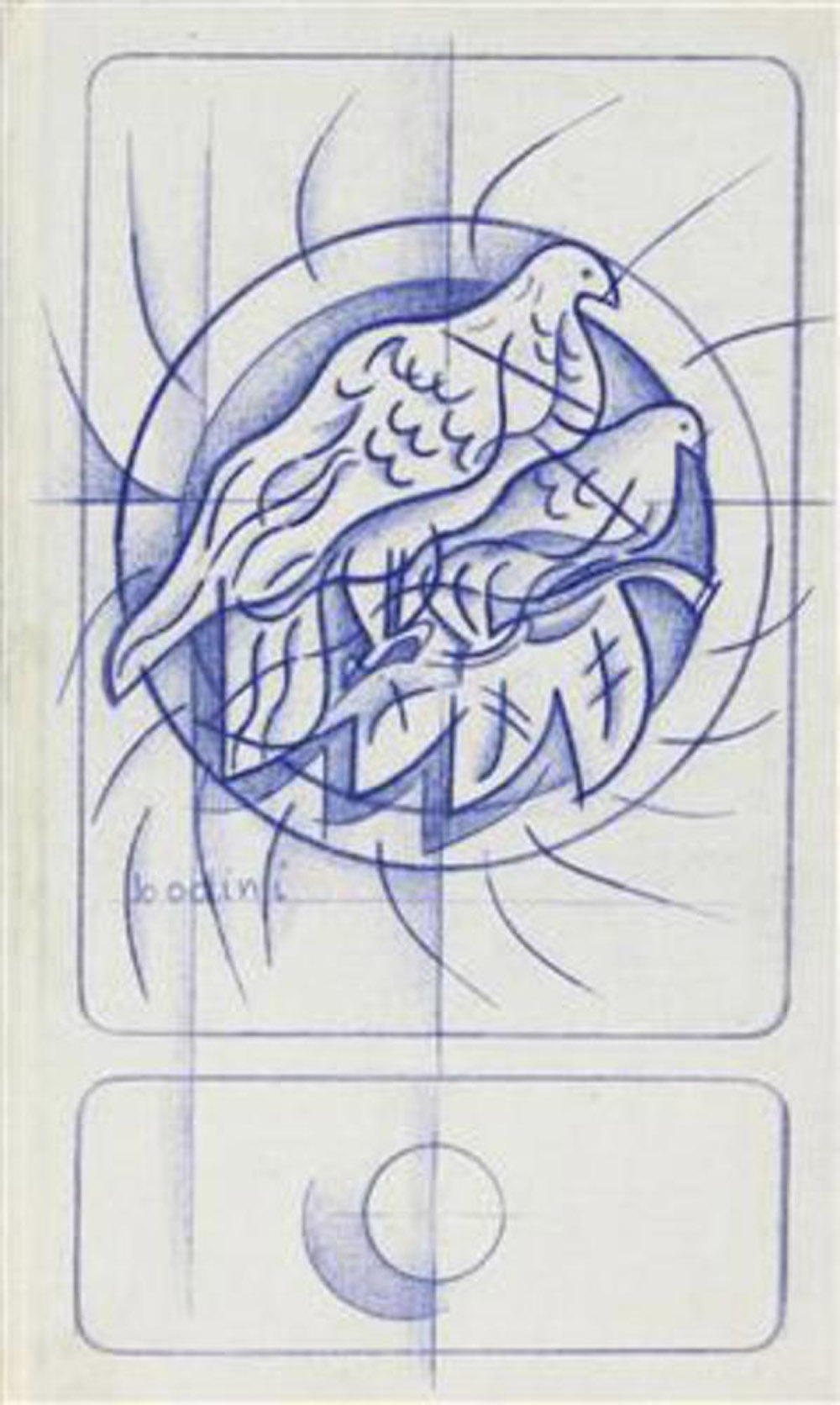 Floriano Bodini, Senza titolo, 1986, tecnica mista su tela applicata su copertina di agenda dメarte distribuita dalla Galleria Spiga di Milano, cm. 25x14,5, firmata al centro a sinistra, certificazione su fotografia della Galleria Arte Spiga di Milano