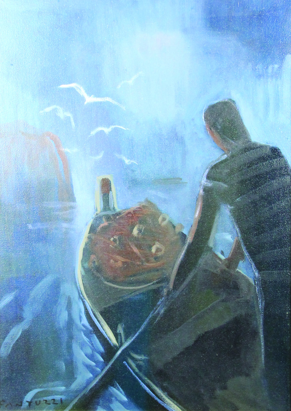 Eliano Fantuzzi, Pescatore, olio su tela, cm. 70x50, firmato in basso a sinistra e al retro, etichetta della Galleria d'Arte La Contemporanea di Genova al retro, certificato di autenticità della Casa delle Aste di Chiavari