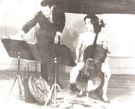 Charlotte Moorman, Cage en Moorman in "26'/.1499" for a String Player, van Cage, 1975, stampa fotografica, cm. 49x63, firmata e datata al retro, timbro "Archivio Francesco Conz" al retro