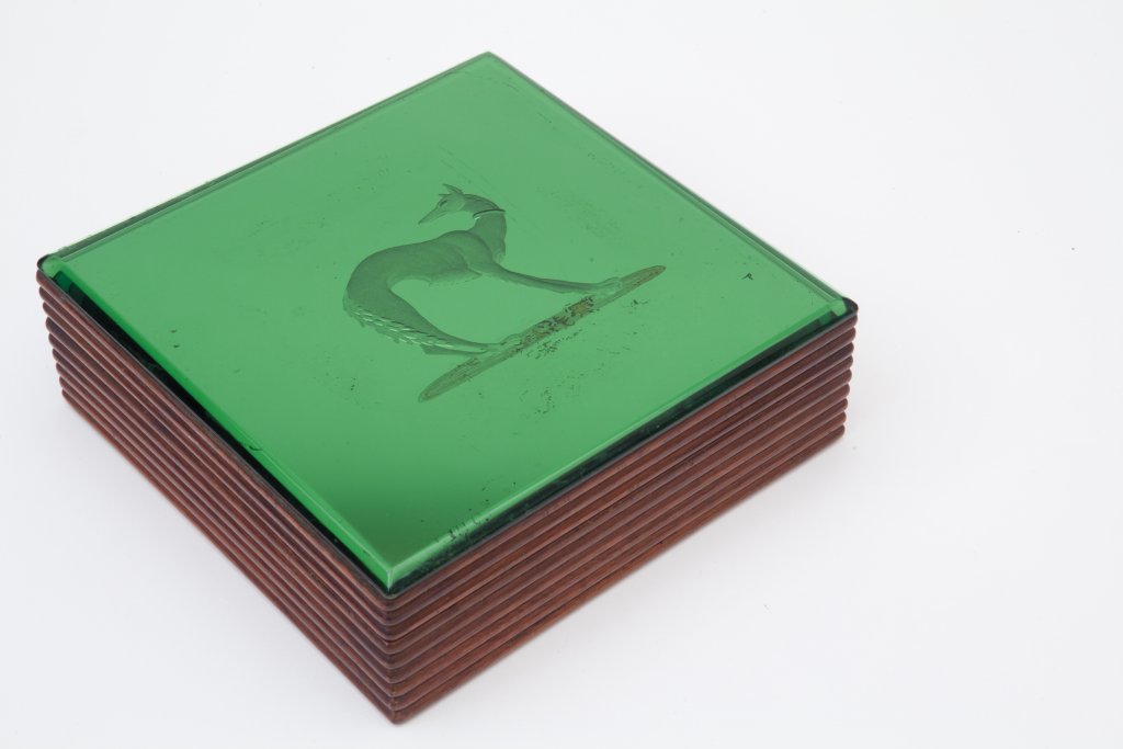 UNA SCATOLA PORTASIGARI, anni '30 - '40. Legno di mogano, cristallo colorato...