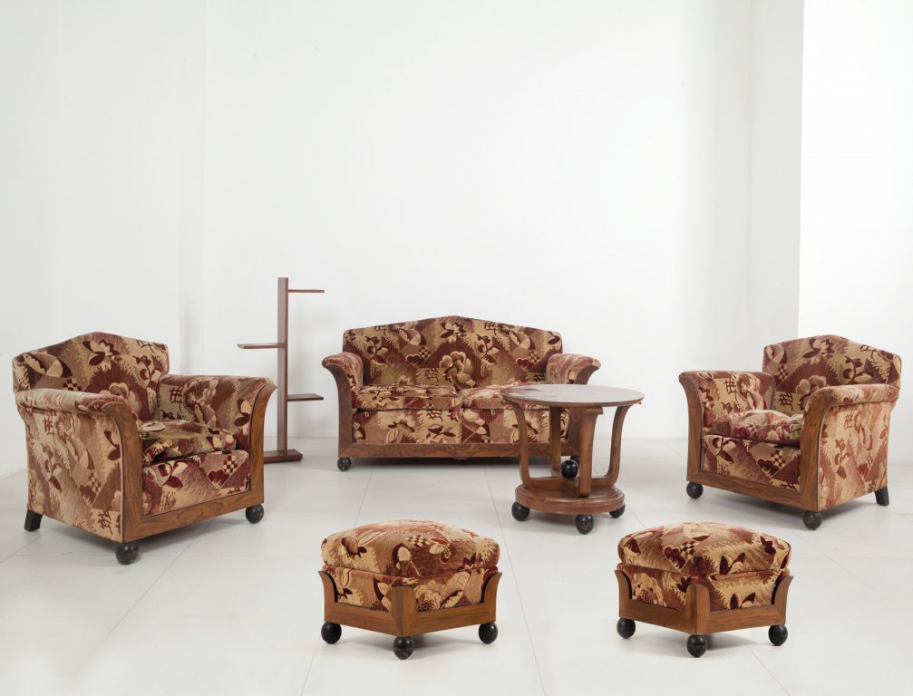 UN SALOTTO, anni '30composto da un divano, 2 poltrone, 2 poggiapiedi, un...
